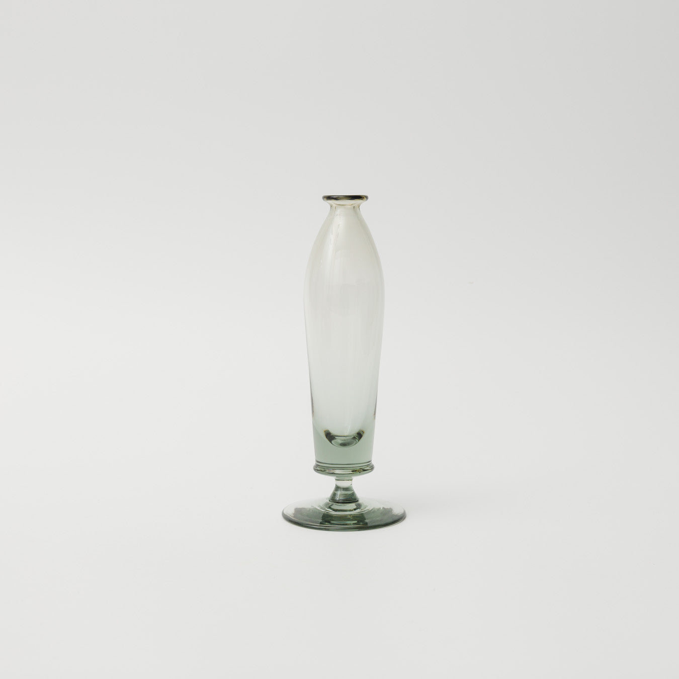 やわらかなグレーの透明感と、脚元に重心を感じるフォルムが印象的な小さめな一輪挿し。