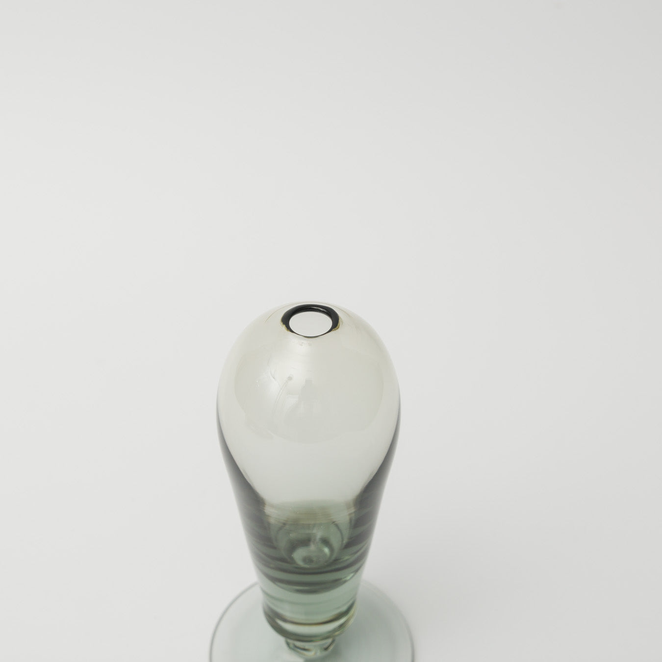 やわらかなブルーグレーの透明感と、まるみのあるフォルムが印象的な小さめな一輪挿し。