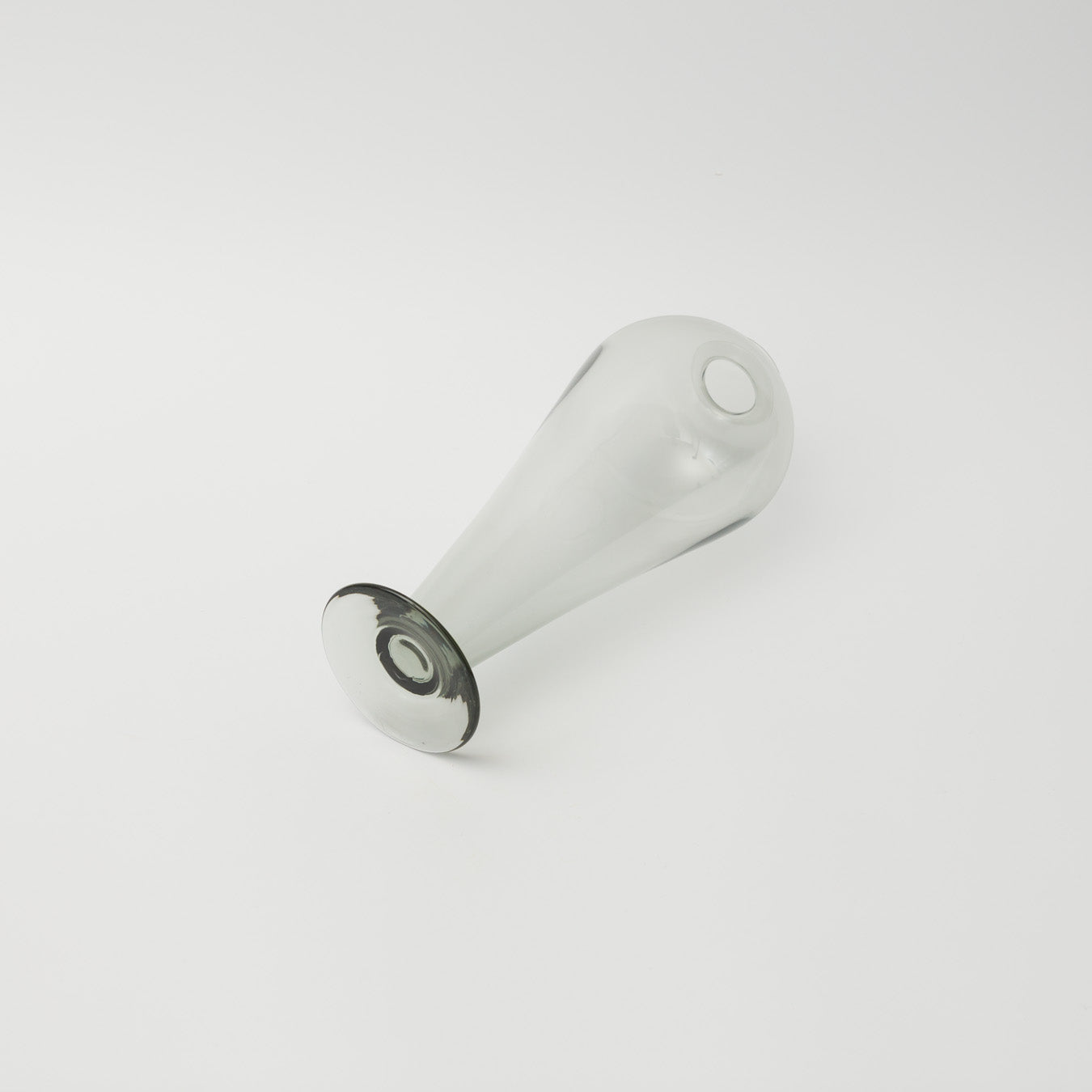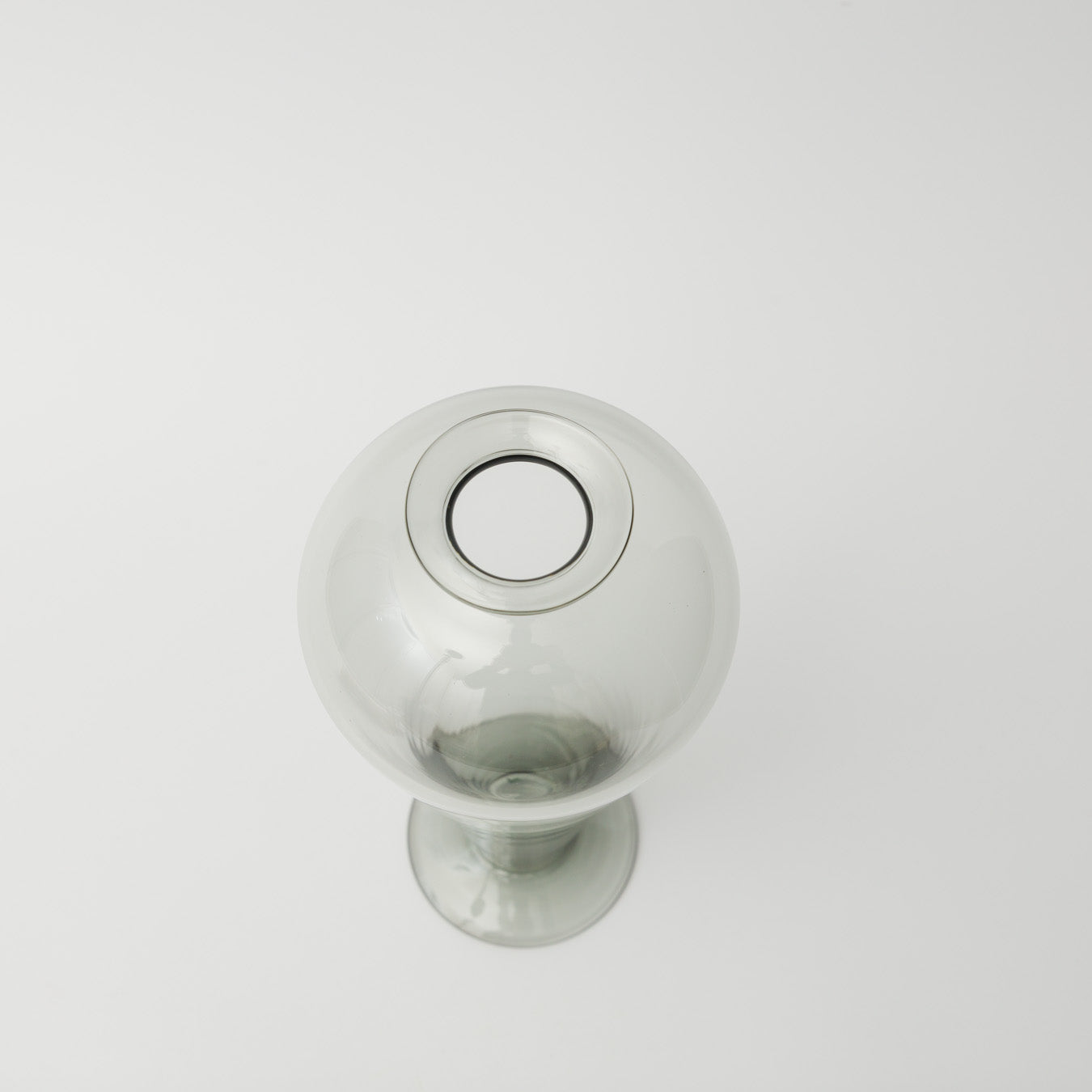 風船のようなやわらかな丸みが印象的な、ガラスのフラワーベース。 やわらかなグレーの透明感が美しく、空間にそっとなじむ静かな佇まいです。