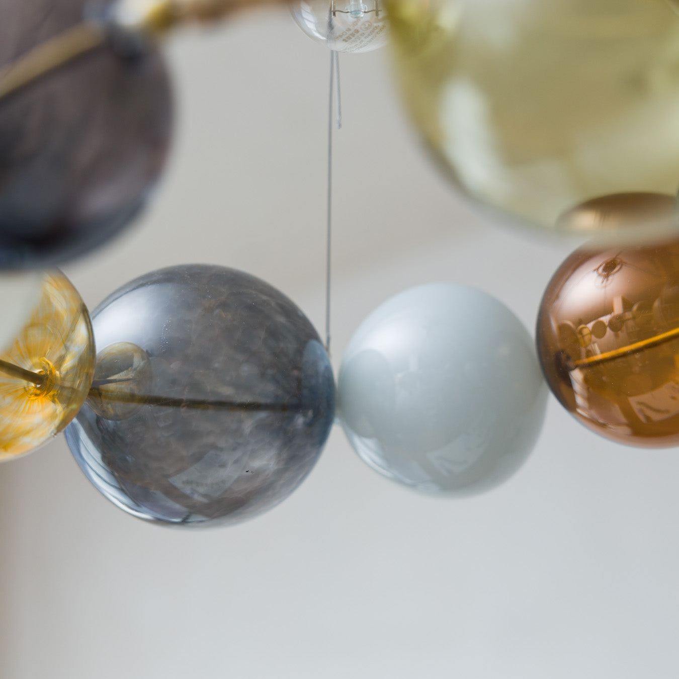 吹きガラスで制作された球体の色ガラスが宙に浮かぶような軽やかさがあり、空間にやわらかなリズムを生み出します。