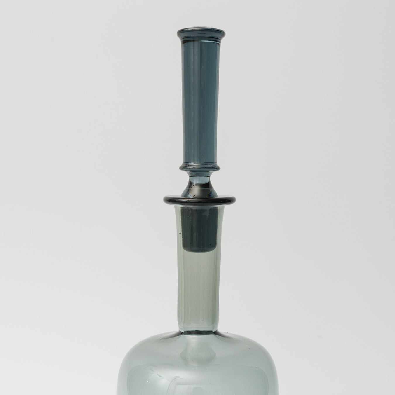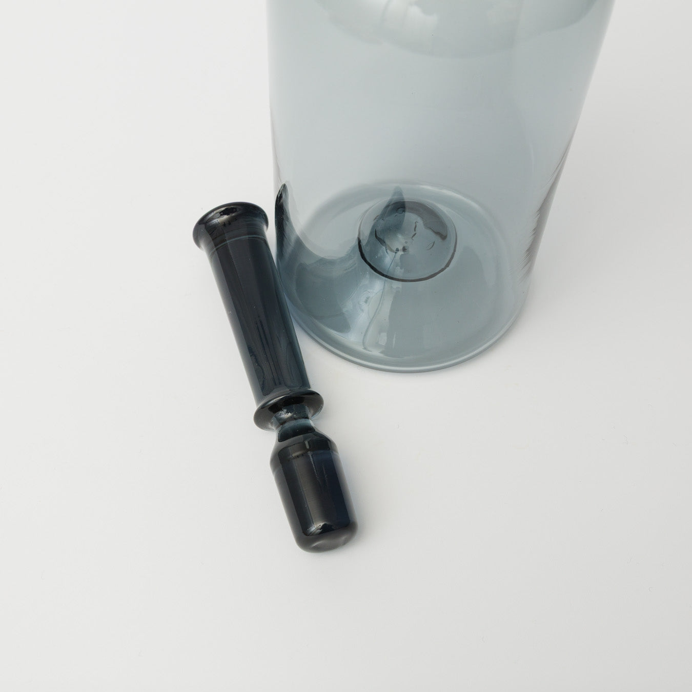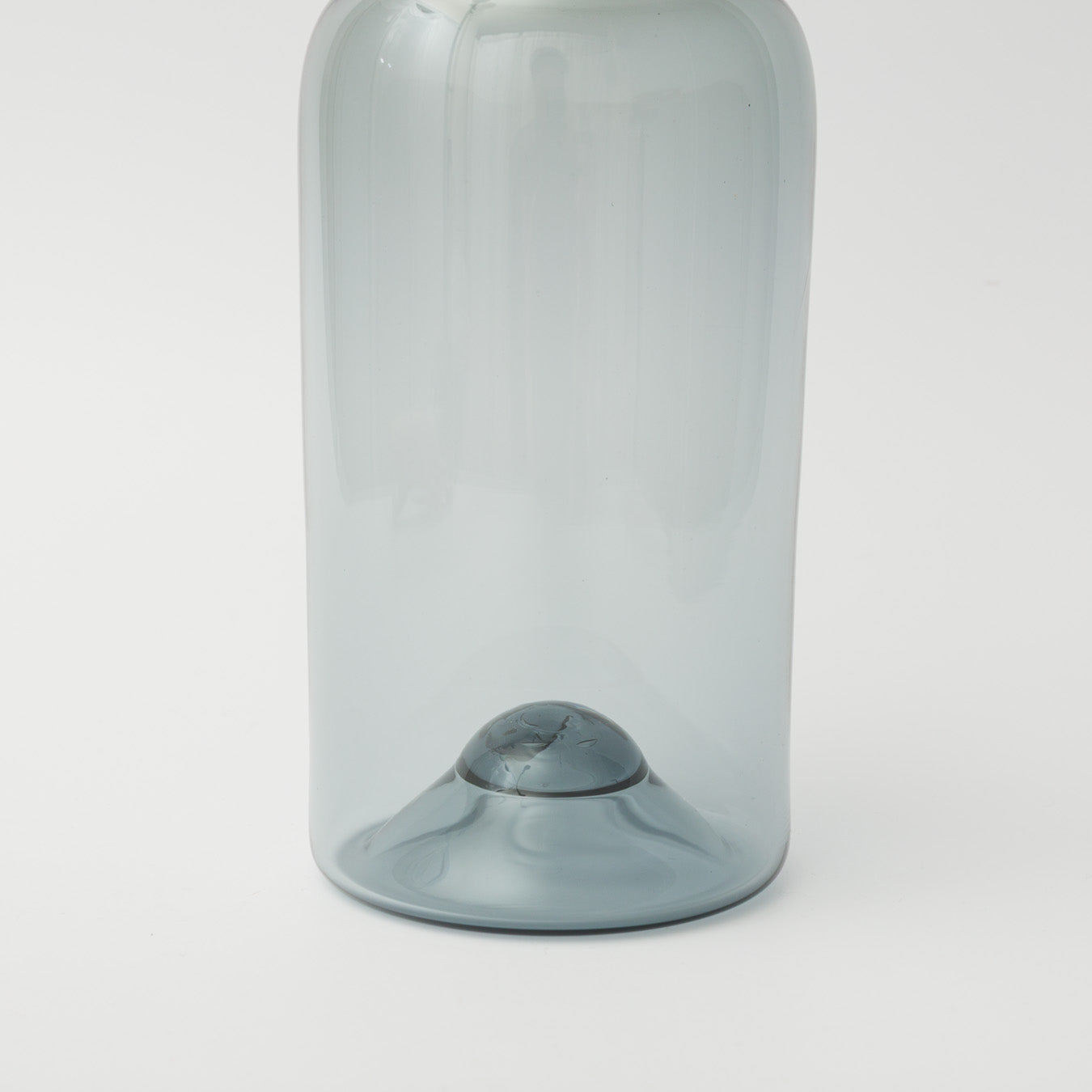 やわらかなブルーグレーの透明感が美しい、ガラスの大きめなボトル。置いてあるだけでも静かな存在感があります。