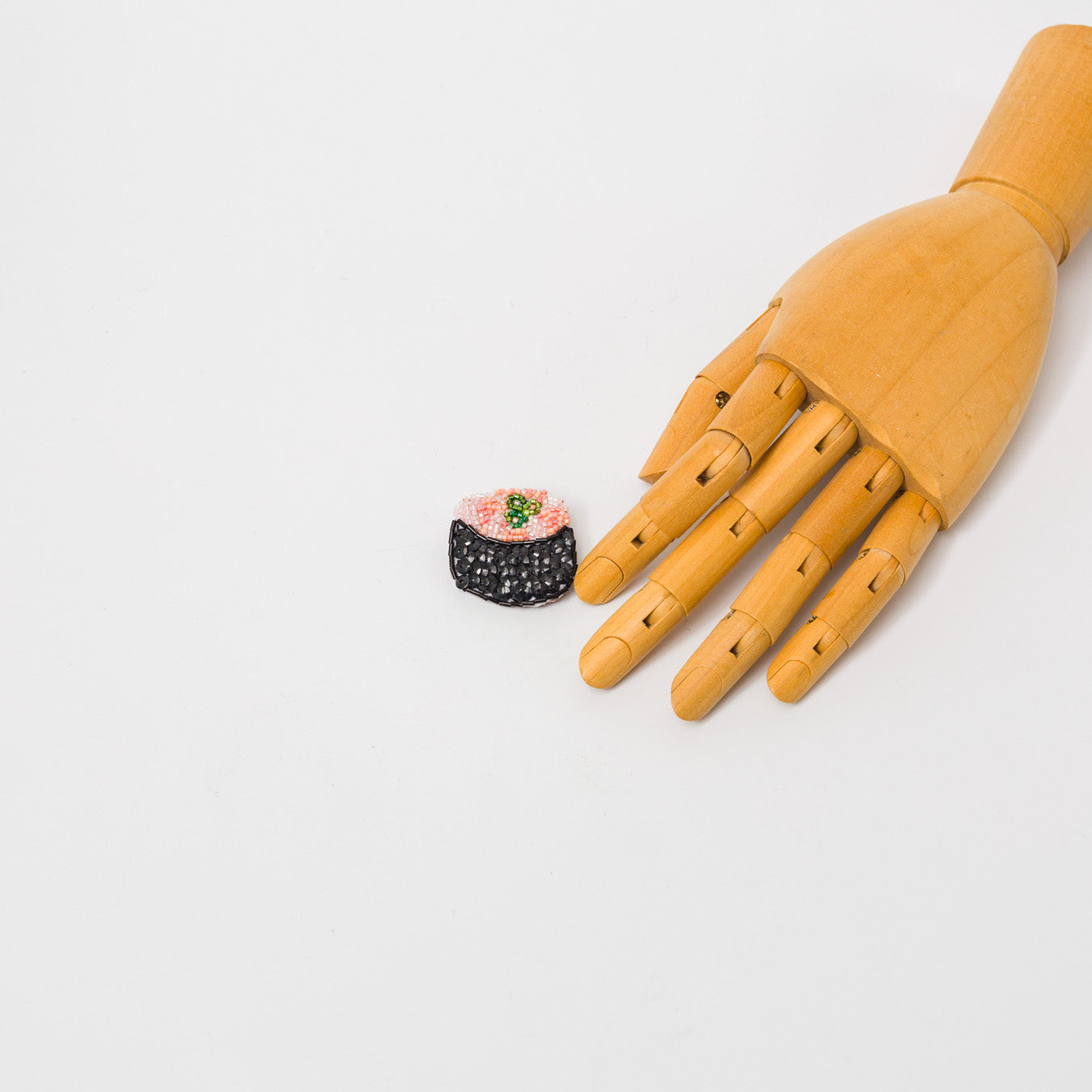 ひと粒ずつ丁寧に縫い留めて仕立てた、お寿司モチーフのビーズ刺繍ブローチ。